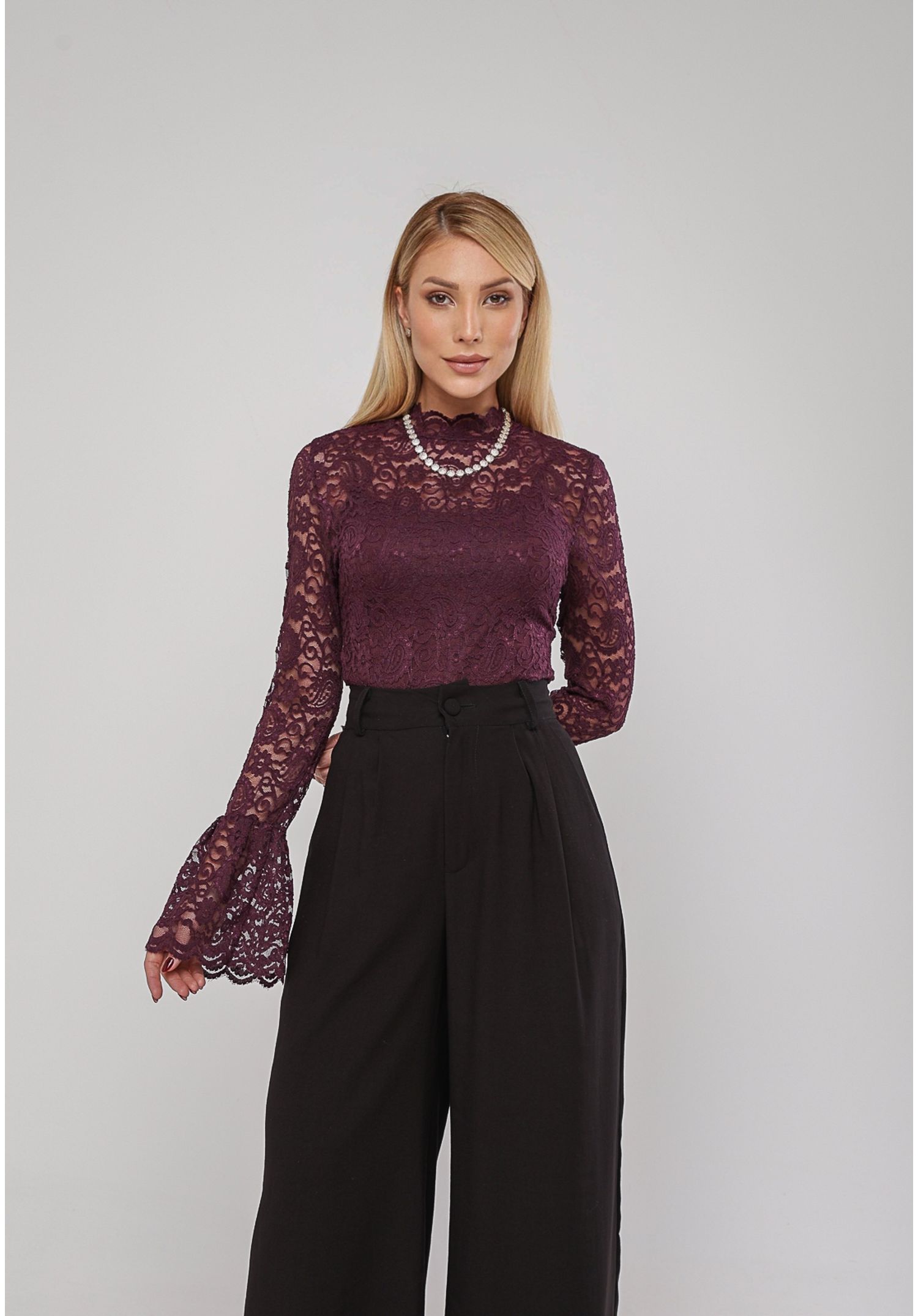 Blusa De Renda Com Manga Longa Flare Roxo Salvatore