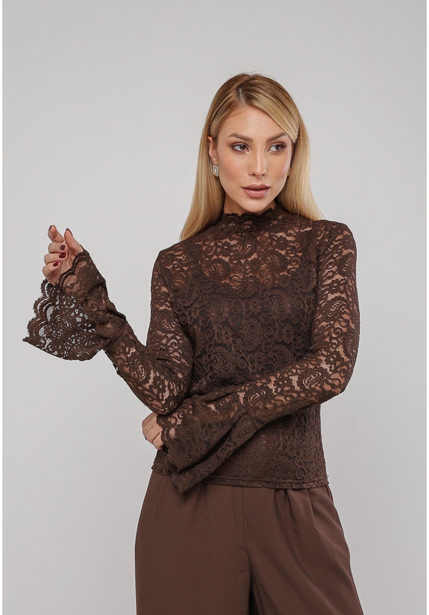 A modelagem ajustada ao corpo destaca a silhueta de forma confortável, e as mangas longas com punho flare criam movimento e charme, tornando a peça ideal para produções elegantes e femininas. Confeccionada em renda trabalhada, possui caimento leve e acabamento delicado.
