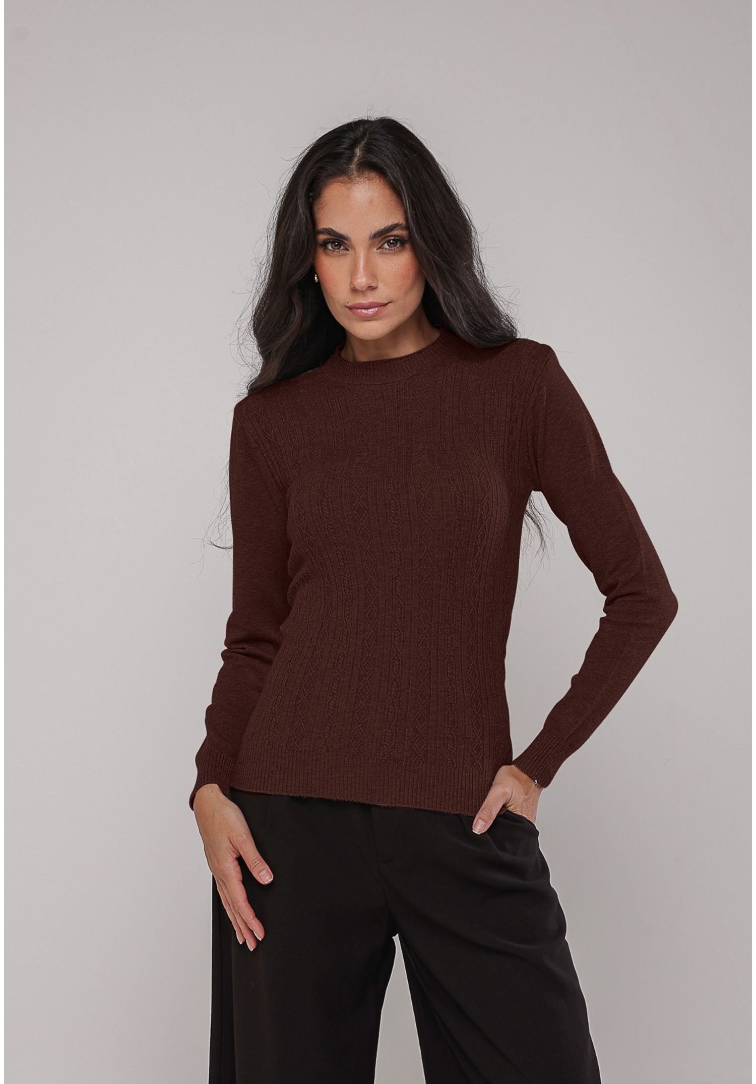 A blusa de tricot texturizada é a escolha perfeita para quem busca sofisticação com um toque de aconchego.
