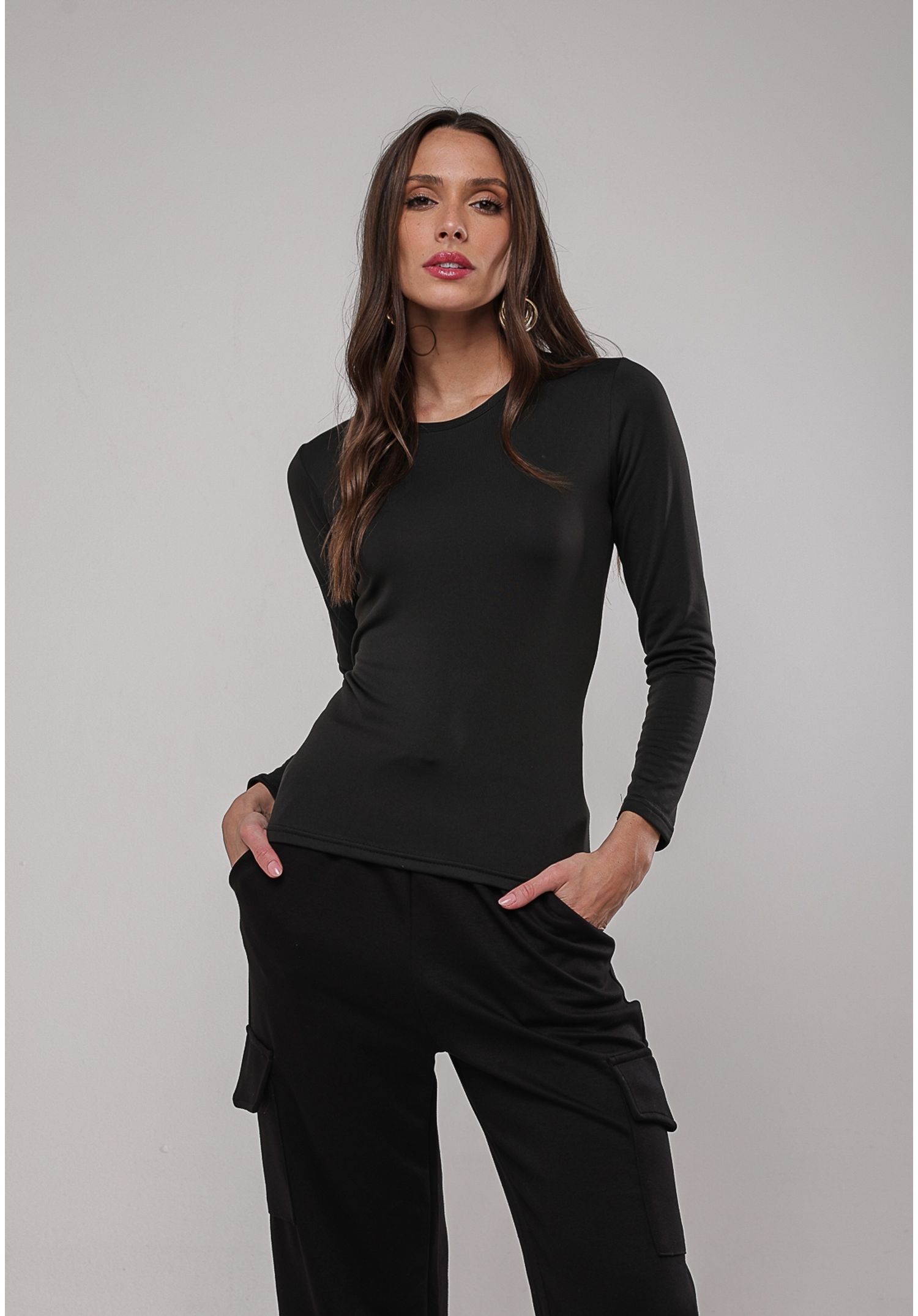 Seu design minimalista com gola redonda e mangas longas torna a blusa uma opção prática para compor diversos looks, desde produções casuais até combinações mais elaboradas para o inverno.