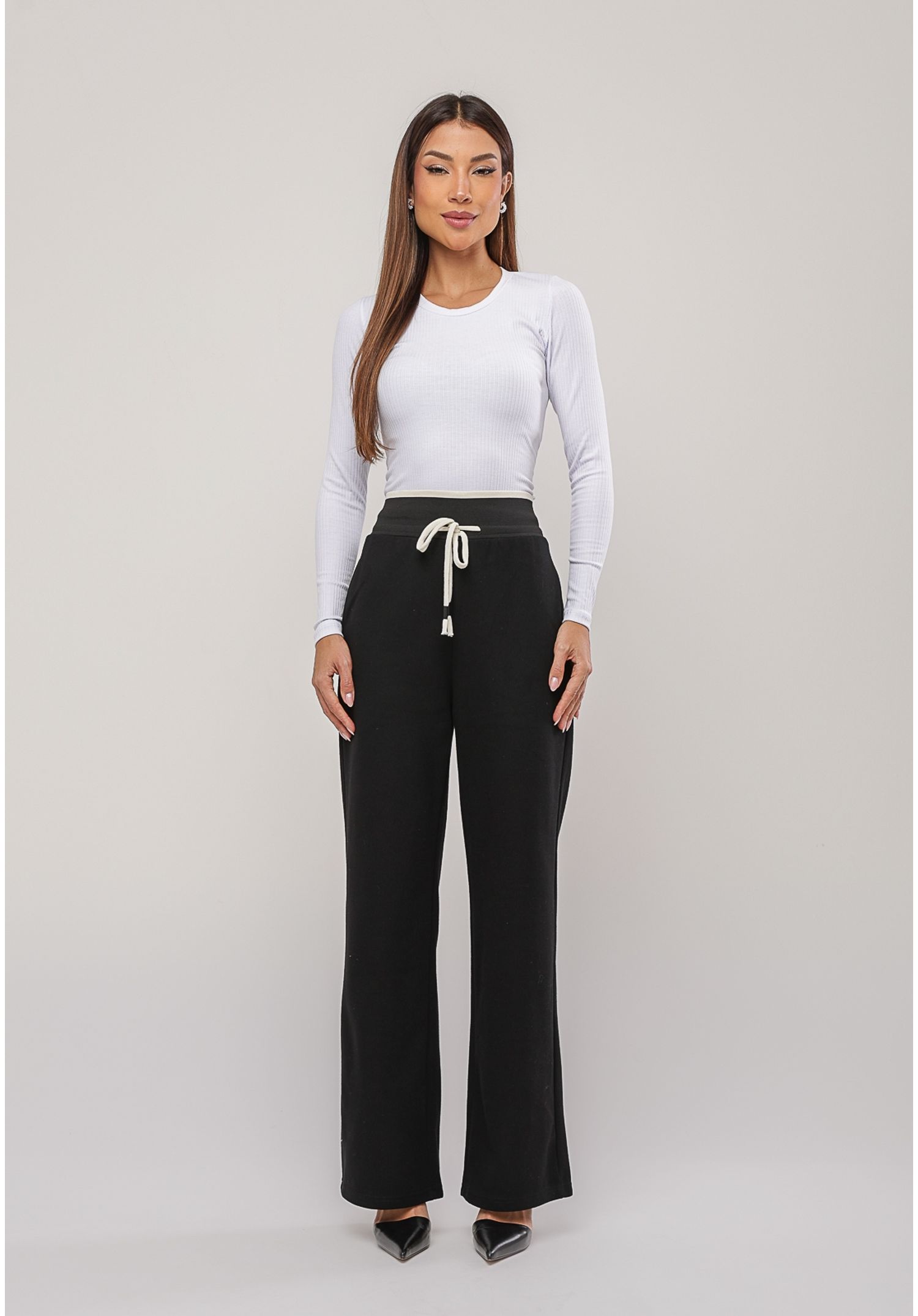 O modelo wide leg, com modelagem mais ampla nas pernas, traz um visual moderno e elegante, além de oferecer um caimento confortável e sofisticado. A calça conta com cós canelado anatômico, que se ajusta ao corpo com suavidade, proporcionando mais conforto e melhor sustentação na cintura.