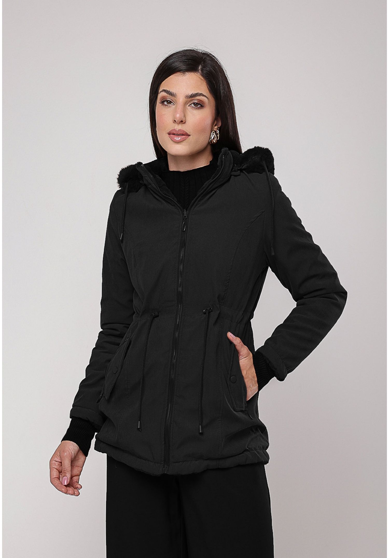 O casaco conta com capuz funcional, oferecendo proteção extra contra o vento e o frio, além de fechamento frontal em zíper que facilita o uso no dia a dia.