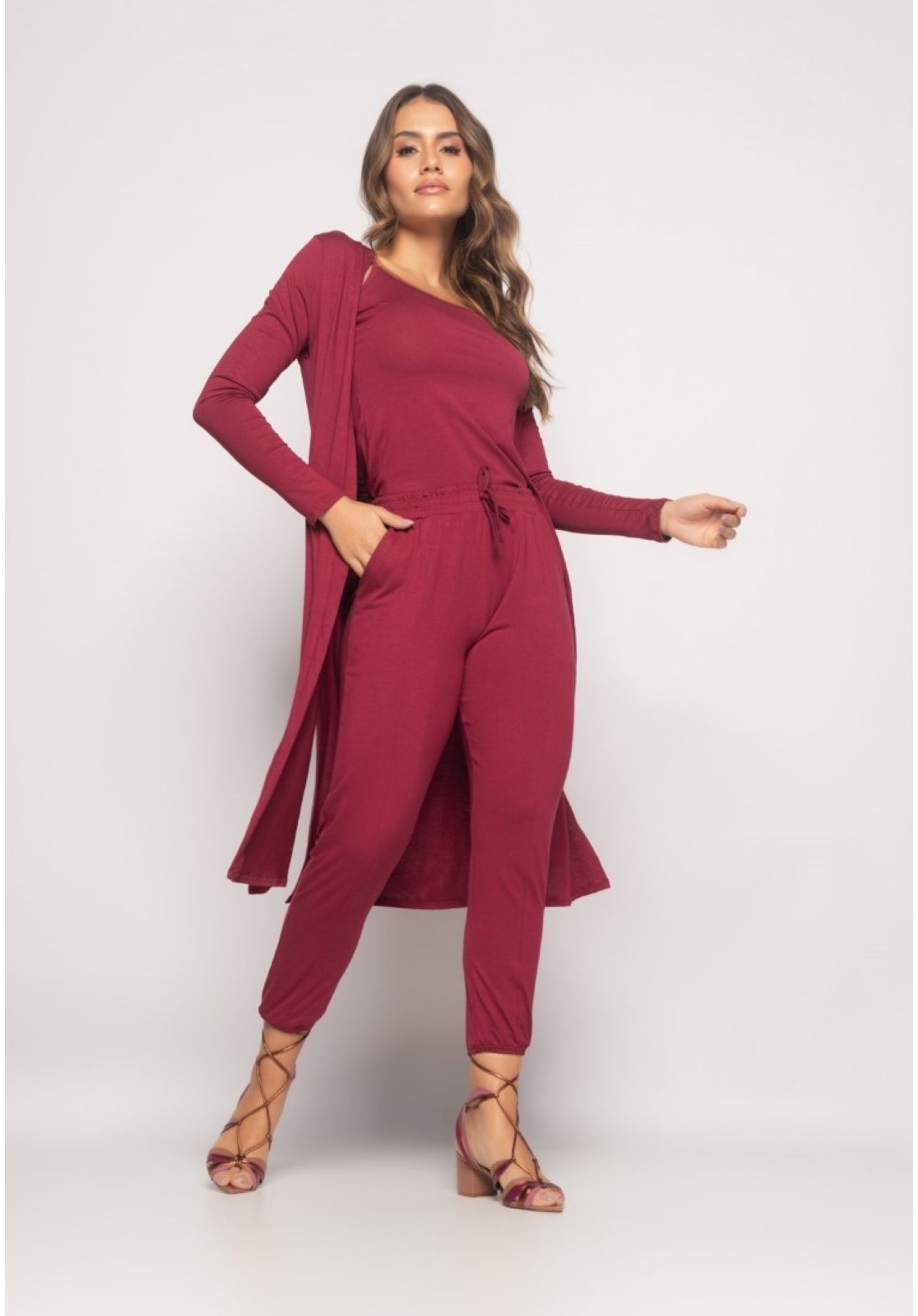 Conjunto Com Kimono, Regata e Jogger Malha Vinho Salvatore