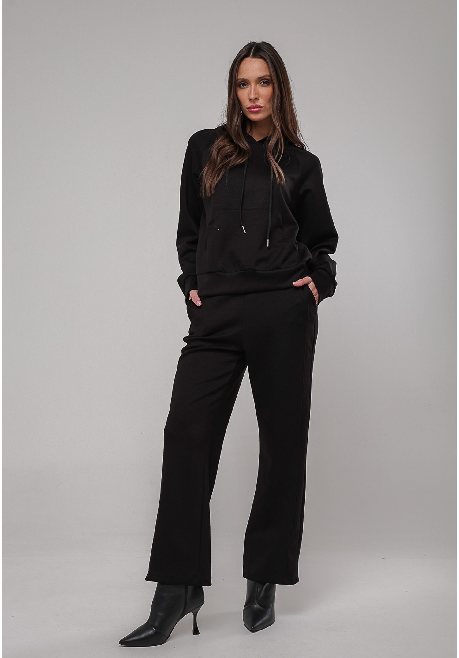 O bolso frontal estilo canguru complementa o design com funcionalidade e charme, enquanto a modelagem levemente solta confere um caimento fluido e extremamente confortável, valorizando a silhueta com naturalidade.