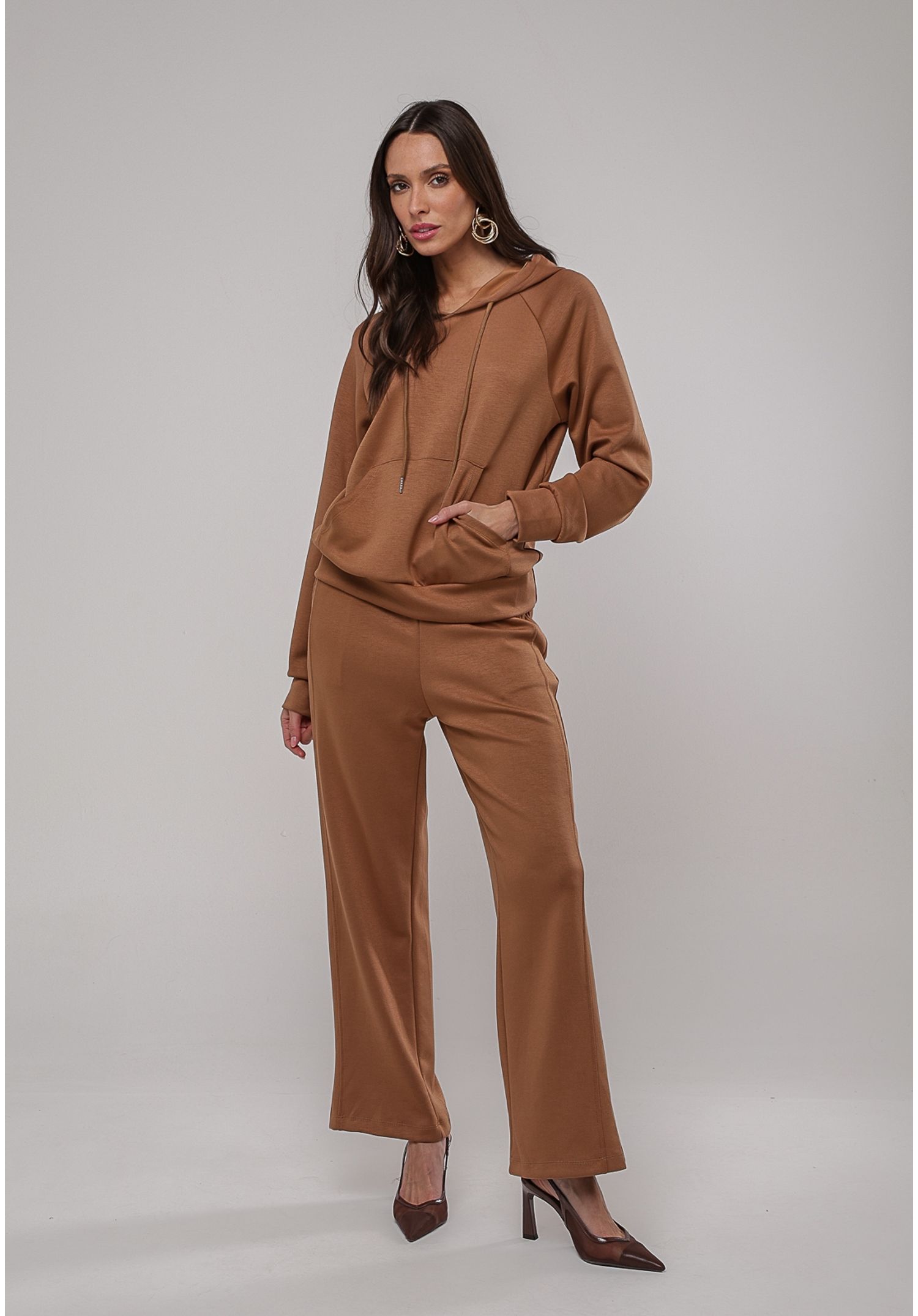 O bolso frontal estilo canguru complementa o design com funcionalidade e charme, enquanto a modelagem levemente solta confere um caimento fluido e extremamente confortável, valorizando a silhueta com naturalidade.
