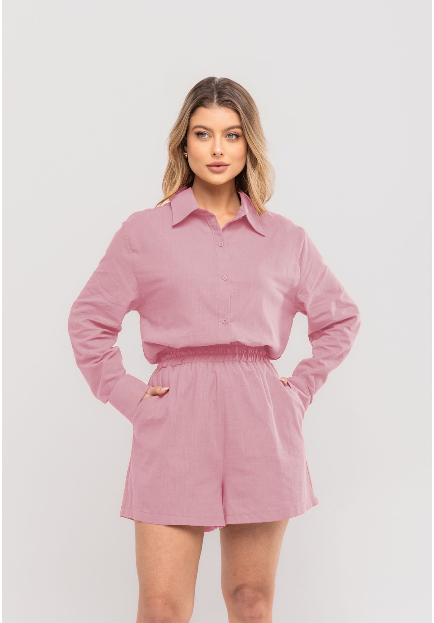 Conjunto Feminino De Camisa E Short Em Algodão Rosa Salvatore