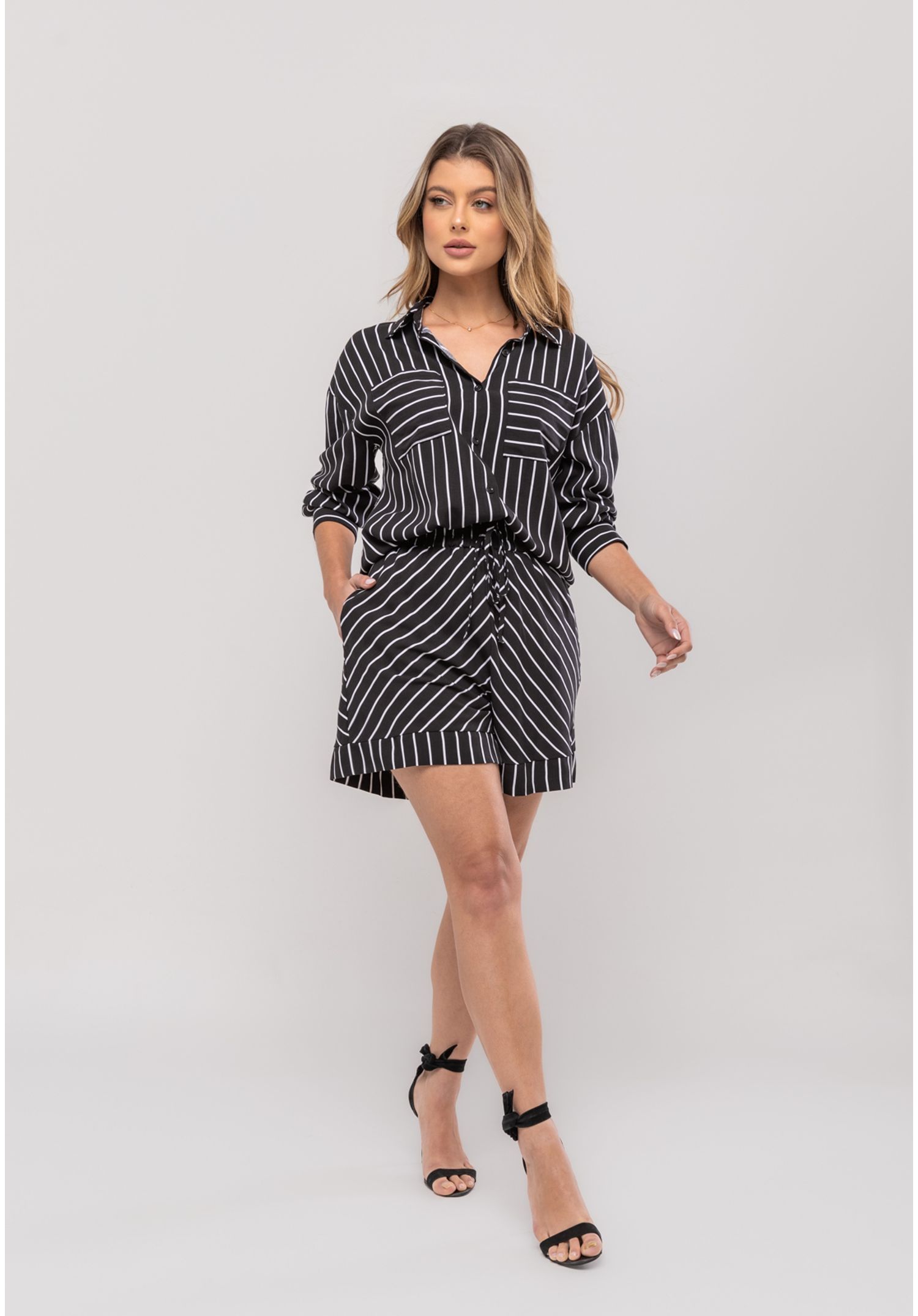 Conjunto Listrado Com Camisa Manga Longa e Short Preto Salvatore
