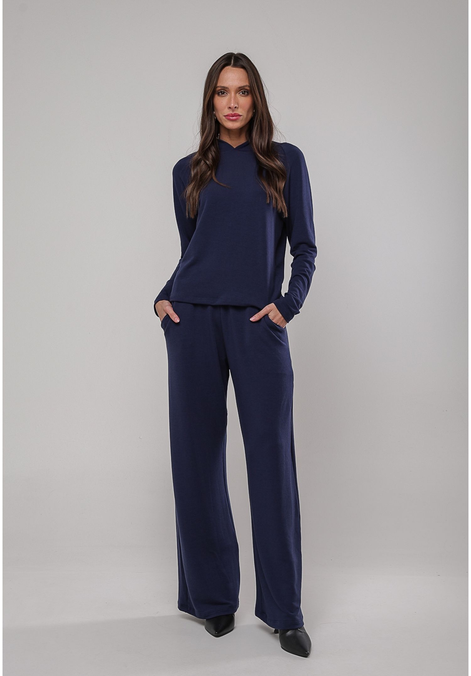 Conjunto Moletinho Wide Leg Com Casaco de Capuz Marinho Salvatore