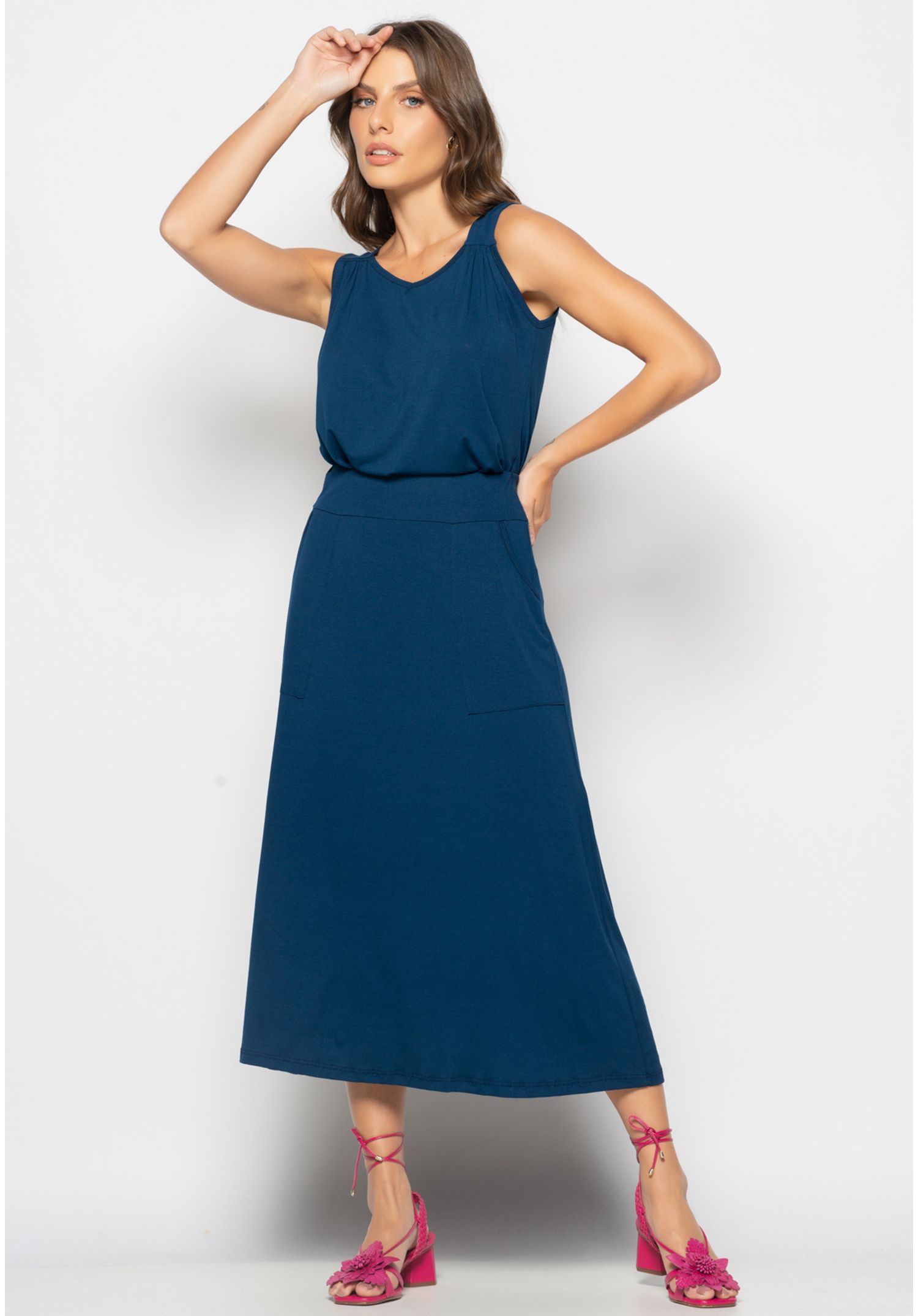 A regata possui um shape amplo, com decote V que valoriza o visual, e alças delicadas com detalhes em drapeado, conferindo um toque de charme à peça.