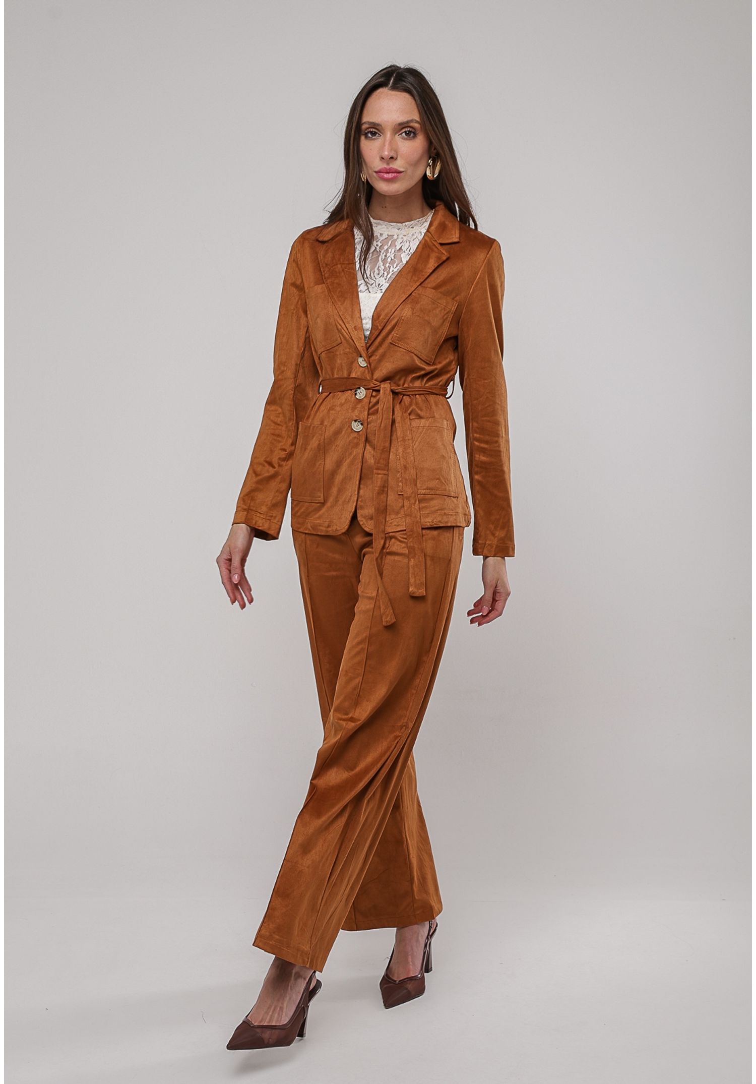 Conjunto Suede Blazer com Faixa e Calça Wide Leg Caramelo Salvatore