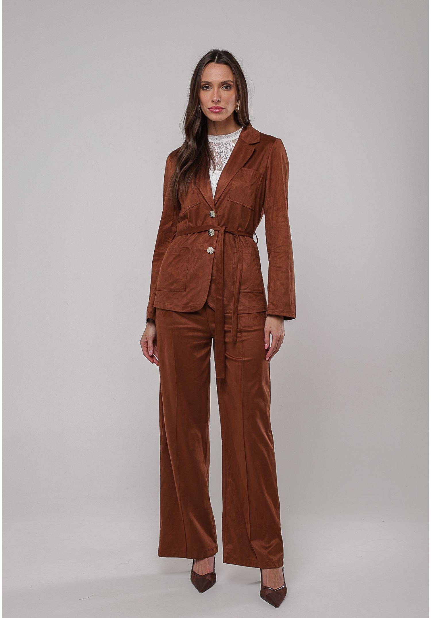 Conjunto Suede Blazer com Faixa e Calça Wide Leg Marrom Salvatore
