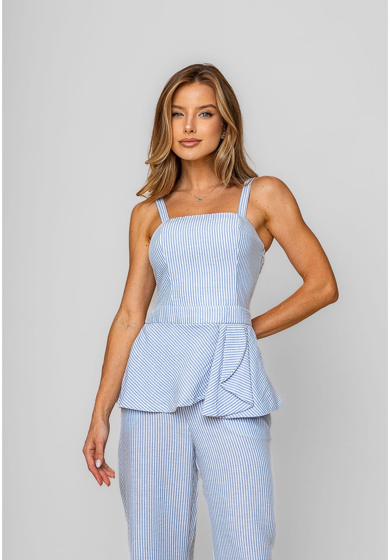 Confeccionada em tecido leve com listras verticais, ela traz um toque de frescor e elegância, perfeito para os dias mais quentes.