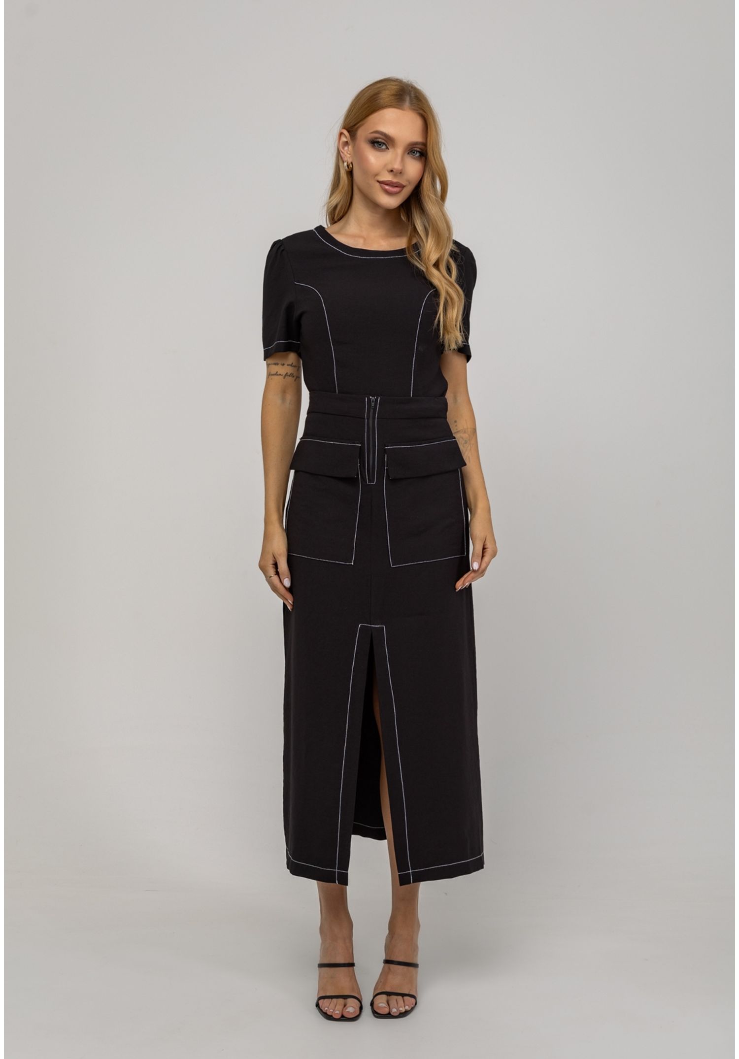 O recorte central com fenda frontal proporciona mobilidade e um toque de sensualidade discreta, equilibrando o estilo clássico com um toque contemporâneo.