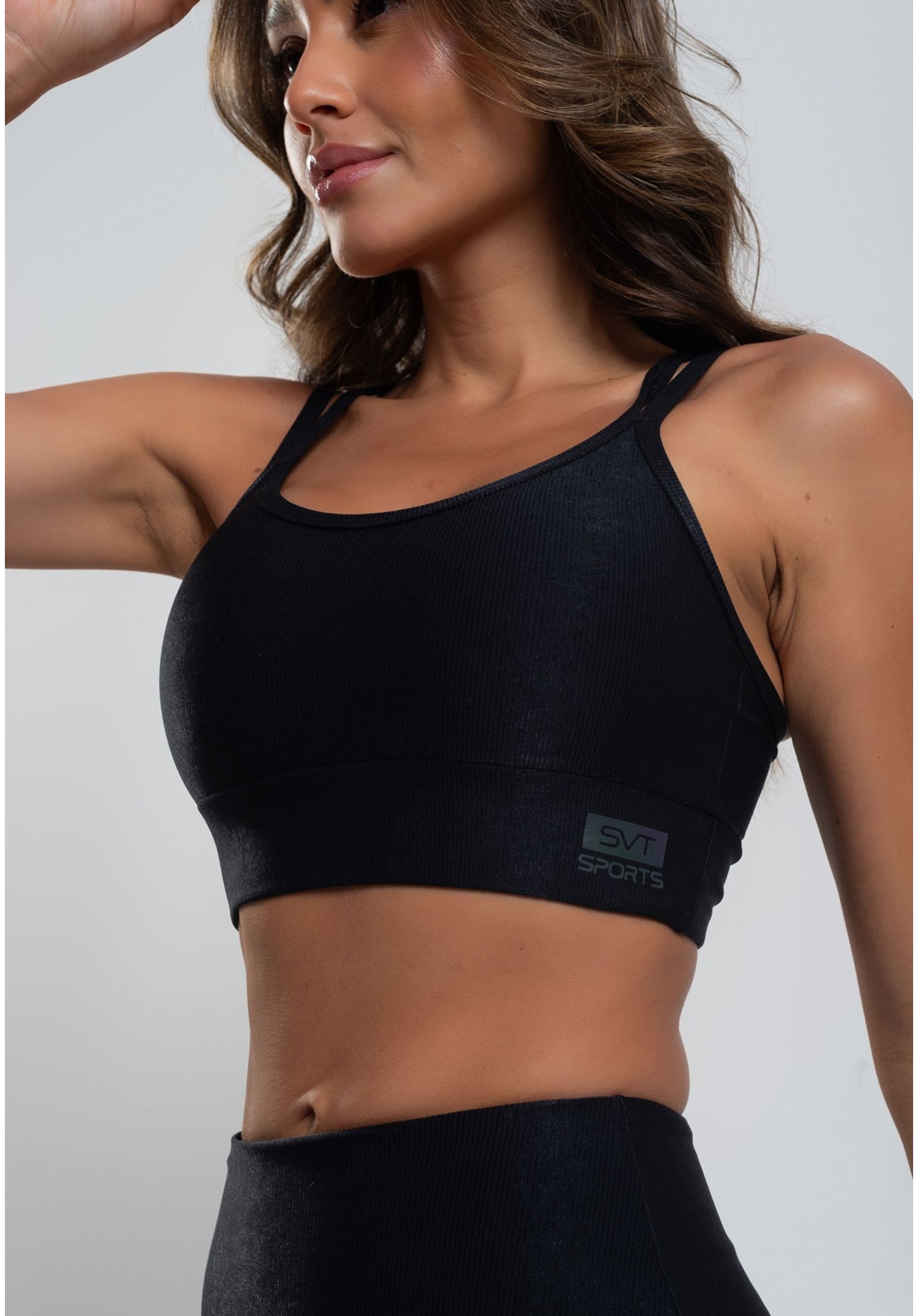 Top Suplex Canelado Brilho Decote e Tiras Preto Salvatore Fashion