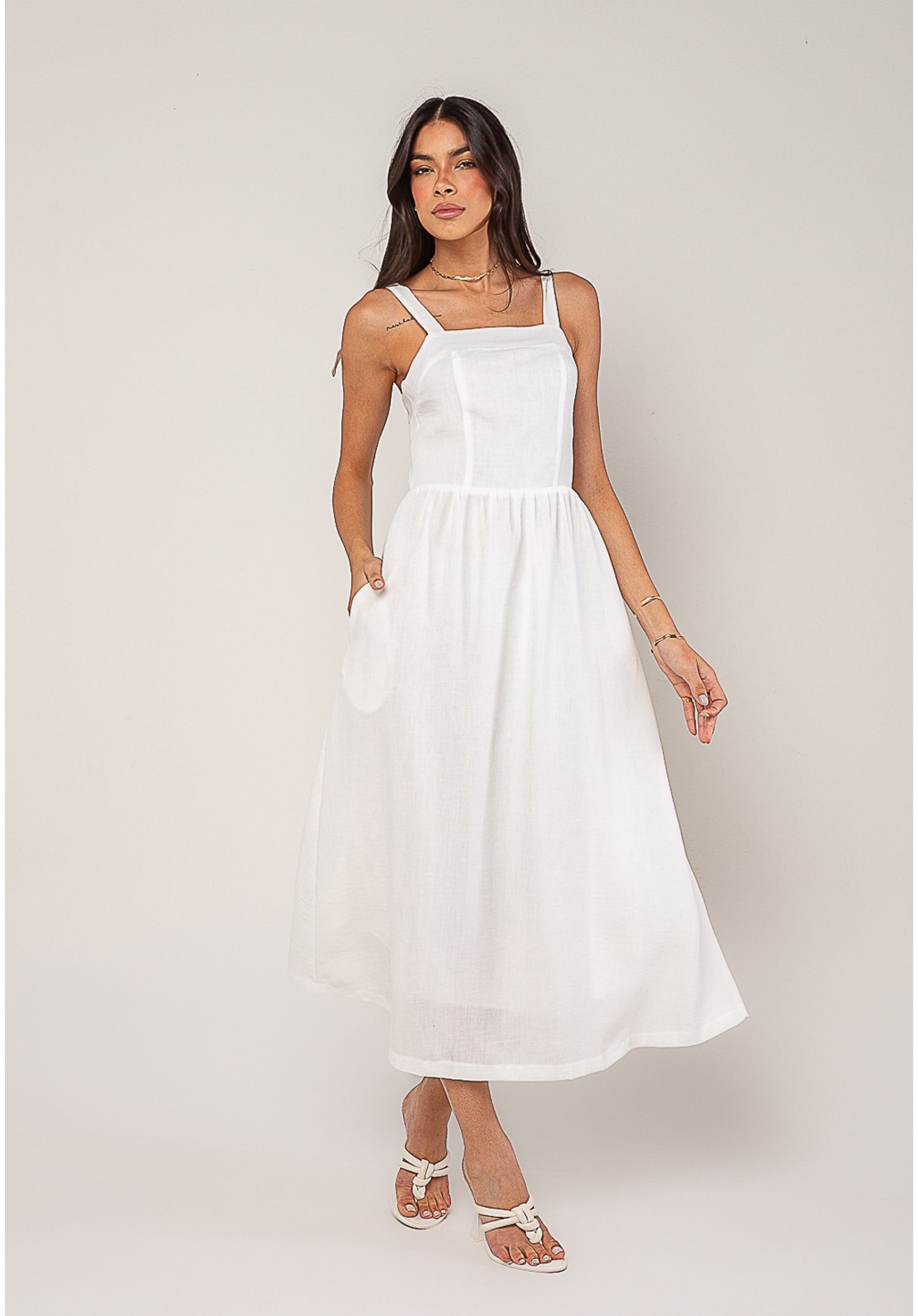 Vestido Alfaiataria Midi Com Alças Largas e Amarração Branco Salvatore