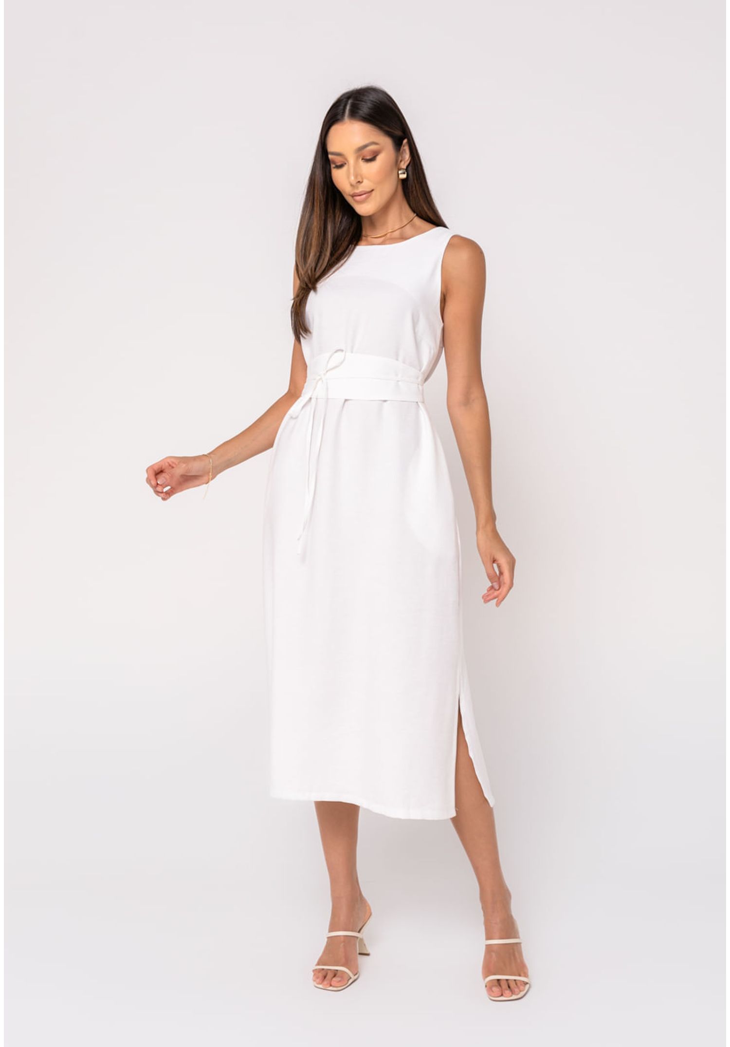 Vestido Midi Feminino Fendas Laterais com Faixa Branco Salvatore