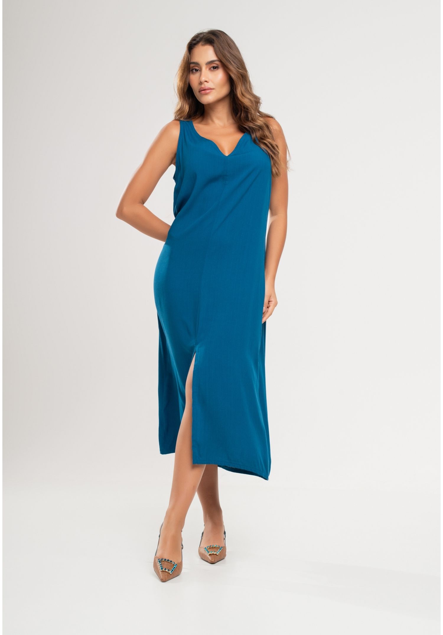 Vestido Midi Regata Fenda Viscolinho Azul Salvatore Fashion